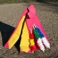 Der Umhang, traditionell in Pink-Gelb gehalten hat eine Höhe von ca.115 cm.